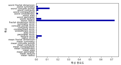 의사결정나무로 모델을 만들었을 때 특성 중요도 시각화 # 첫 노드였던 'worst radius'가 가장 중요한 특성임을 알 수 있음 => 첫 노드에서 두 클래스를 잘 나누고 있음
