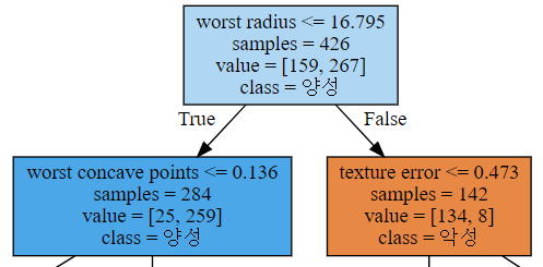 ## 첫번째 노드에 포함된 samples수는 426개이며, 0으로 선택된건 159개 1로 선택된건 267개임을 알 수 있고,