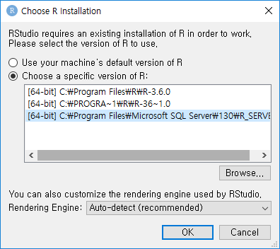 도구 > Global Options > R Sessions > R version > Microsoft SQL Server 130선택