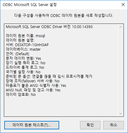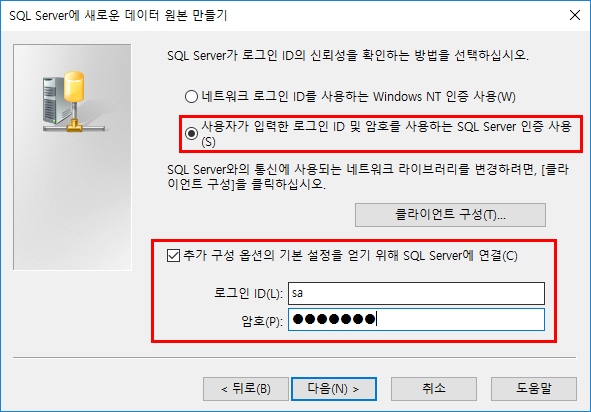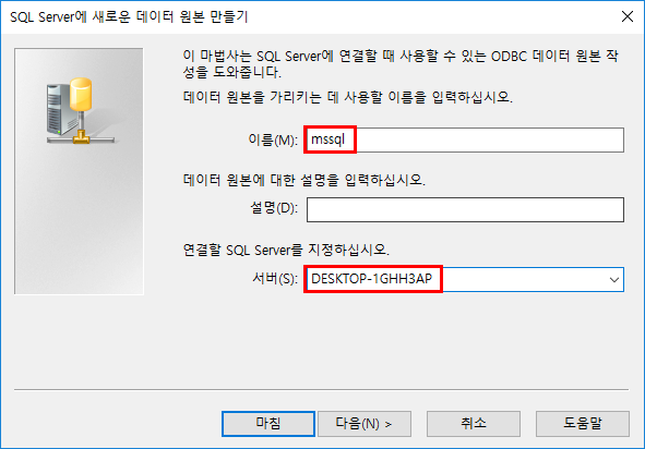 서버는 연동시킬 SQL 서버명(또는 아이피 주소)을 적어주세요~