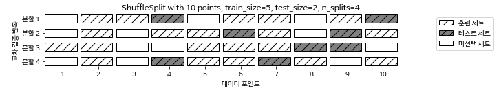 train_size만큼 훈련 세트를 만들고, test_size만큼(훈련 세트와 중첩되지 않은)의 포인트로 테스트 세트를 만들도록 분할