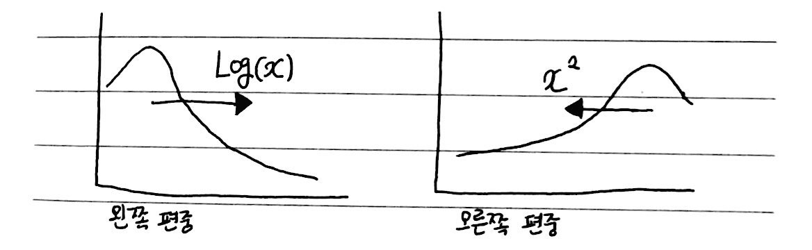 큰 자료값을 더 작게 (왼쪽으로 편중된 경우) : x¼, √x, logx, 1/x